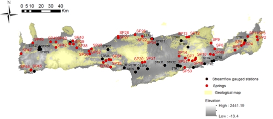 Εικόνα 1. Γεωλογικός χάρτης της Κρήτης με τα 46 σημεία μετρήσεων καρστικών πηγών και τα 22 σημεία μετρήσεων επιφανειακών νερών.