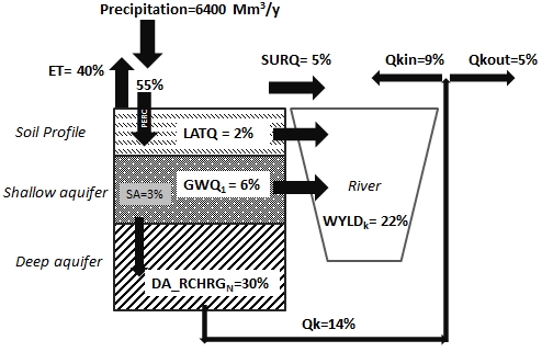 Εικόνα 2. Υδρολογικό ισοζύγιο Κρήτης για το έτος 1987 (μέσο έτος βροχόπτωσης 1983-2009). (ET: εξατμισοδιαπνοή; PERC: διήθηση; SURQ: επιφανειακή απορροή; LATQ: παράλληλη ροή; GWQ1: βασική ροή; SA: shallow aquifer storage; DA_RCHRGN: amount of water recharge in the deep aquifer without the contribution for springs that discharge inside (Qkin) and outside (Qkout) Crete; WYLDk.